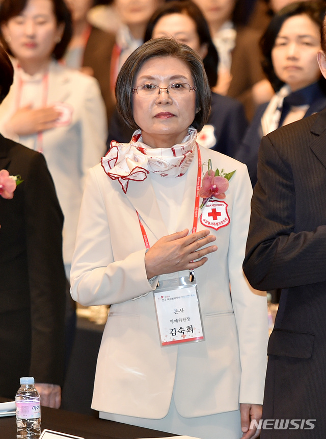 【대구=뉴시스】우종록 기자 = 대한적십자사 ‘제58차 전국 여성봉사특별자문위원 총회’가 열린 16일 오후 대구 수성구 만촌동 호텔인터불고 컨벤션홀에서 박경서 대한적십자사 회장, 김숙희(이낙연 국무총리 부인) 본사 명예위원장을 비롯한 각 광역시·도 자문위원회 참석자들이 국민의례를 하고 있다. 2019.04.16.