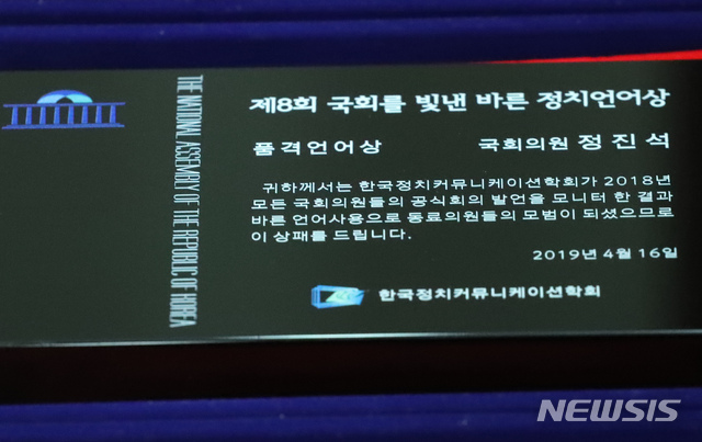 【서울=뉴시스】고승민 기자 = 16일 서울 여의도 국회 의원회관에서 열린 '제8회 국회를 빛낸 바른정치언어상 시상식'에 수상자 중 자유한국당 정진석 의원의 상패가 놓여 있다.