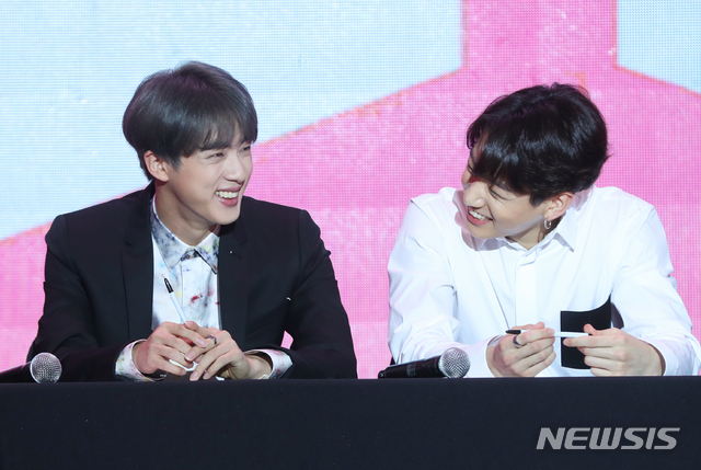 【서울=뉴시스】조수정 기자 = 그룹 방탄소년단(BTS) 진, 정국(오른쪽)이 17일 오전 서울 중구 을지로 동대문디자인플라자에서 새 미니앨범 '맵 오브 더 솔 : 페르소나(Map of the soul: Persona)' 발매 글로벌 기자간담회에서 환하게 웃고 있다. '맵 오브 더 솔 : 페르소나'는 지난 16일 빌보드 메인 앨범 차트 '빌보드 200' 1위를 기록했다. 방탄소년단의 '빌보드 200' 1위는 이번이 세번째다. 지난해 5월 발매한 정규 3집 '러브 유어셀프 전 티어'로 한국 가수 최초 '빌보드 200' 1위를 차지, 같은 해 8월 발표한 리패키지 앨범 '러브 유어셀프 결 앤서'도 같은 차트 정상에 올랐다. 2019.04.17. [email protected]