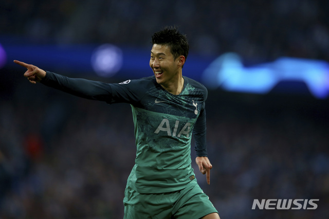 【맨체스터=AP/뉴시스】토트넘의 손흥민이 17일(현지시간) 영국 맨체스터의 에티하드 스타디움에서 열린 맨시티와 2018-2019 UEFA 챔피언스리그 8강 2차전에서 골을 넣고 기뻐하고 있다.