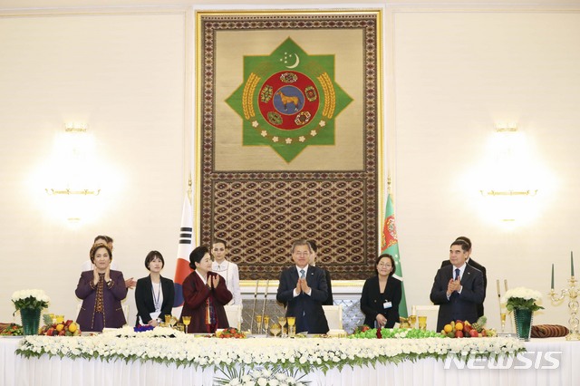 【아시가바트(투르크메니스탄)=뉴시스】박진희 기자 = 투르크메니스탄을 국빈 방문 중인 문재인 대통령과 부인 김정숙 여사가 17일(현지시간) 아시가바트 대통령궁 연회장에서 열린 국빈 만찬에서 구르반굴리 베르디무하메도프 대통령(오른쪽), 맘메도바 국회의장과 박수를 치고 있다. 2019.04.18.