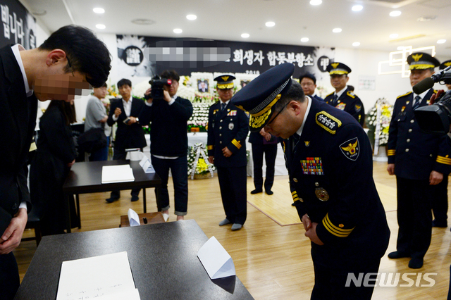 【진주=뉴시스】 차용현 기자 = 18일 오전 민갑룡 경찰청장이 지난 17일 경남 진주시 한 아파트에서 발생한 묻지마 살인사건으로 생을 마감한 희생자 5명의 합동분향소가 마련된 진주혁신도시 내 한일병원 장례식장을 찾아 국화를 올리고 분향을 하며 희생자들을 애도하고 있다. 2019.04.18.