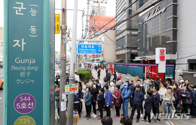 【서울=뉴시스】김병문 수습기자 = 18일 오전 서울 광진구 지하철 5호선 군자역 출구에서 승객들이 임시방편으로 마련된 강동역행 셔틀버스를 기다리고 있다.