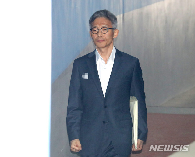 【서울=뉴시스】 전진환 기자 = 서지현 검사를 성추행하고 인사보복을 한 혐의로 1심에서 법정 구속된 안태근 전 검사장이 18일 오후 항소심이 열리는 서울 서초구 서울지법으로 들어가고 있다. 2019.04.18.