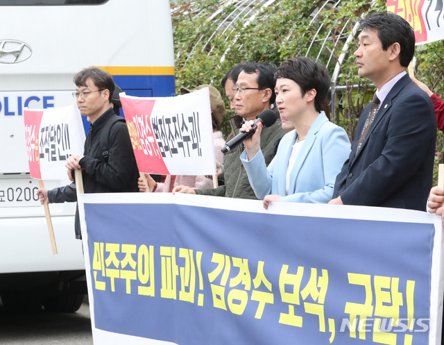 【서울=뉴시스】 전진환 기자 = 김경수 경남지사 보석 석방 규탄 기자회견이 18일 오후 서울 서초구 서울중앙지법 앞에서 이언주 바른미래당 의원이 발언하고 있다. 2019.04.18.