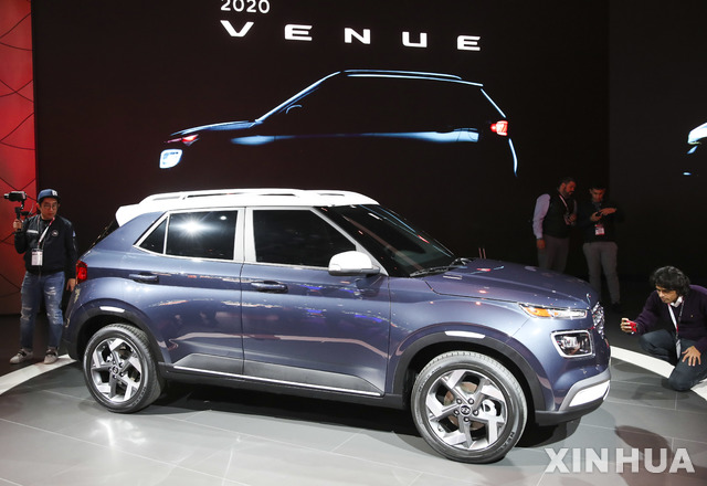 【뉴욕=신화/뉴시스】17일(현지시간) 미국 뉴욕의 제이콥 재비츠 센터에서 2019 국제 모터쇼 언론 공개 행사가 열려 현대자동차의 엔트리 SUV '베뉴'가 공개되고 있다.