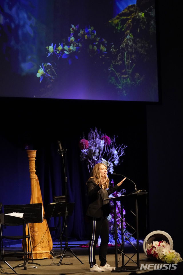 【리틀턴=AP/뉴시스】콜럼바인 고교 총기 난사 사건 20주기를 이틀 앞둔 18일(현지시간) 미 콜로라도주 리틀턴의 한 교회에서 추도식이 열려 당시 재학생이었던 크리스탈 우드만-밀러가 연단에 올라 연설하고 있다.
