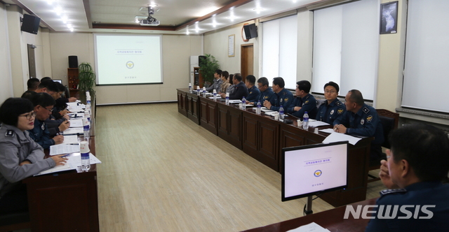 【양구=뉴시스】한윤식 기자 = 강원 양구경찰서(서장 강찬구)는 19일 경찰서 소회의실에서 서장, 각 과장, 파출소장, 계·팀장 등 20명이 참석한 가운데 지역공동체치안 협의체 운영 회의를 개최했다. 2019.04.19. (사진=양구경찰서 제공)