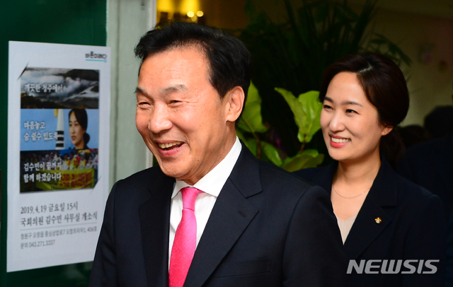 【청주=뉴시스】 인진연 기자 = 19일 충북 청주시 청원구 오창프라자에서 열린 바른미래당 김수민 의원(비례)의 사무소 개소식에서 손학규 대표와 김수민 의원이 입장하고 있다. 2019.04.19