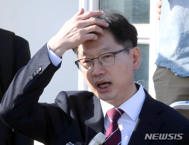 【서울=뉴시스】 전진환 기자 = 드루킹 댓글 조작에 가담한 혐의로 1심에서 실형을 선고 받고 법정 구속된 김경수 경남지사가 17일 오후 법원의 보석허가를 받고 경기도 의왕시 서울구치소를 나와 기자들과 인터뷰하고 있다. 2019.04.20.