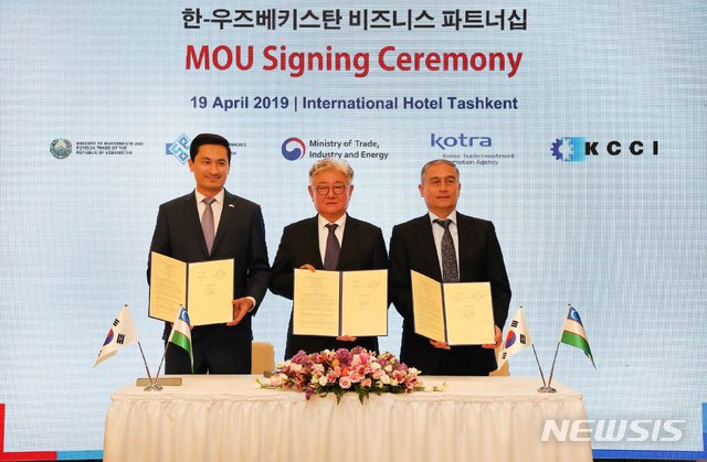 【서울=뉴시스】김선웅 기자 = 산업통상자원부가 19일(현지시간) 우즈베키스탄 우즈엑스포 컨퍼런스홀에서 한-우즈벡 양국 기업인이 참석한 가운데 전통적인 협력 분야인 에너지, 자원 뿐만 아니라 양국 협력이 자율주행, 스마트 헬스케어, 에너지 효율 등으로 확대되어 우즈베키스탄의 산업 다각화를 돕고 양국 간 협력이 양적으로 뿐 만 아니라 질적으로 고도화되는 10건의 '한-우즈벡 산업,무역,에너지 협력 MOU 체결식을 가졌다고 20일 밝혔다. 2019.04.20. (사진=산업통상자원부 제공)