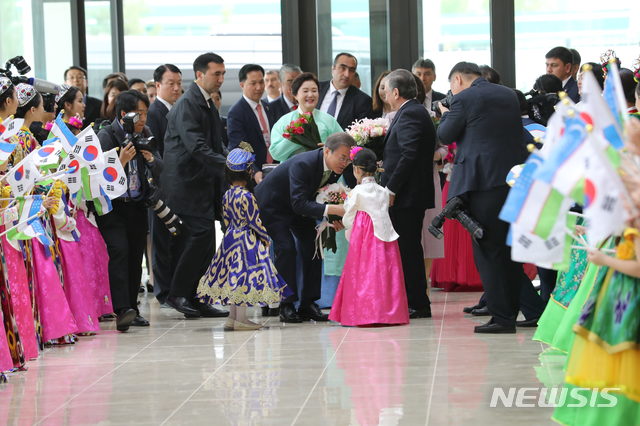 【타슈켄트(우즈베키스탄)=뉴시스】박진희 기자 = 우즈베키스탄을 국빈방문 중인 문재인 대통령과 부인 김정숙 여사가 20일 오전(현지시각) 타슈켄트 한국문화예술의 집 개관식에 참석하며 화동으로부터 꽃다발을 받고 있다. 2019.04.20.