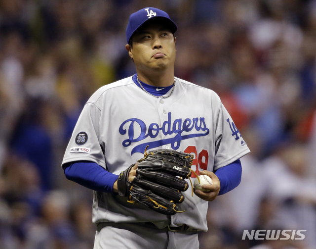 【밀워키=AP/뉴시스】 LA 다저스의 류현진이 21일(한국시간) 미국 위스콘신주 밀워키의 밀러파크에서 열린 2019 메이저리그(MLB) 밀워키 브루어스와의 원정경기에 선발 등판, 6회말 크리스티안 옐리치에 솔로 홈런을 허용한 후 아쉬운 표정을 짓고 있다. 2019.04.21