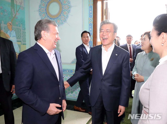 【사마르칸트(우즈베키스탄)=뉴시스】박진희 기자 = 우즈베키스탄을 국빈방문 중인 문재인 대통령이 20일 오후 (현지시간) 울루그벡 천문대에서 샤프카트 미르지요예프 대통령과 양국 역사에 대한 이야기를 하며 웃음을 짓고 있다.