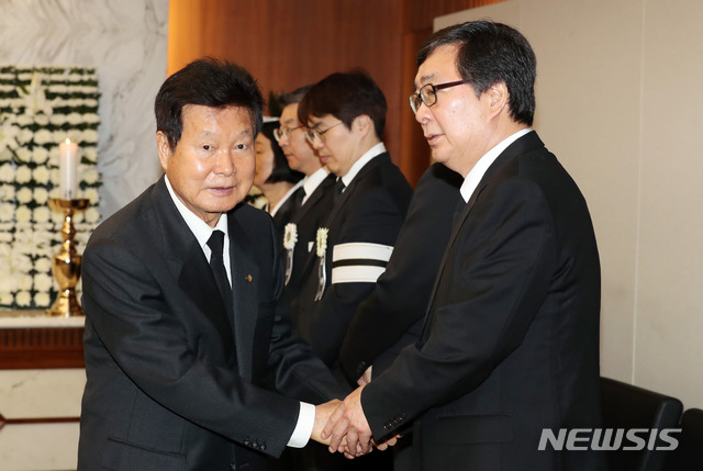 【서울=뉴시스】김진아 기자 = 한화갑 전 의원이 21일 서울 신촌 세브란스병원 장례식장에 마련된 김홍일 전 의원의 빈소에 조문을 마친 뒤 김홍업 전 의원등 유족들과 인사하고 있다. 2019.04.21.