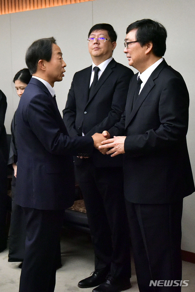 【서울=뉴시스】김진아 기자 = 고(故) 김영삼 전 대통령의 아들인 김현철 사단법인 김영삼민주센터 상임이사가 21일 서울 서대문구 세브란스병원장례식장에 마련된 김대중 전 대통령 장남인 故 김홍일 전 국회의원 빈소를 찾아 조문을 하고 차남 김홍업 전 의원, 삼남 김홍걸 민족화해협력범국민협의회 대표 상임의장과 인사를 하고 있다. 2019.04.21.