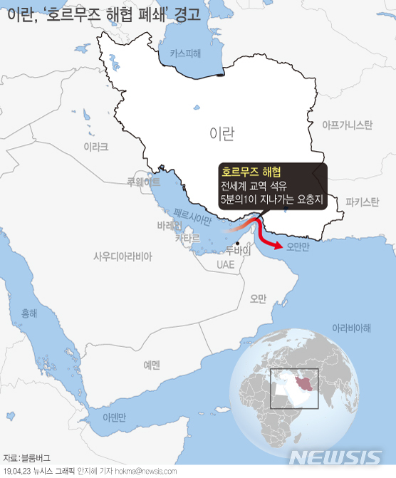 【서울=뉴시스】미국의 이란 원유 수입금지 제재와 관련, 이란 군부는 국제 원유의 주요 수송로인 호르무즈 해협을 폐쇄하겠다고 경고했다. (그래픽=안지혜 기자)