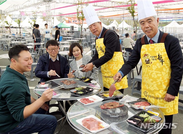 【서울=뉴시스】23일 경기 과천 렛츠런파크 주차장에서 열린 한우숯불구이축제에서 전국한우협회 김홍길 회장(오른쪽 첫번째)과 한우자조금 민경천 위원장(오른쪽 두번째)이 시민들과 함께 우리 한우를 숯불에 직접 구워먹고 있다. 2019.04.23. (사진=한우자조금 제공)