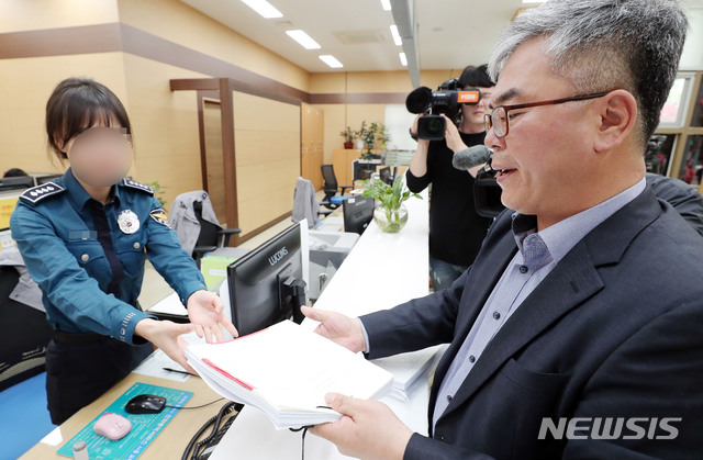 【서울=뉴시스】박미소 수습기자 = 김수민 작가의 법정대리인 박훈 변호사가 23일 오후 서울 종로구 서울지방경찰청 민원실에서 고(故) 장자연 사건 주요 증언자인 배우 윤지오 씨에 대한 고소장을 접수하고 있다.2019.04.23.