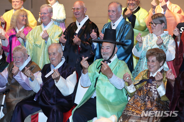 【서울=뉴시스】이윤청 수습기자 = 유엔군 참전 영연방(영국,캐나다,호주,뉴질랜드) 유엔참전용사와 가족들이 23일 서울 중구 그랜드앰배서더호텔에서 한복을 입고 기념촬영하고 있다.