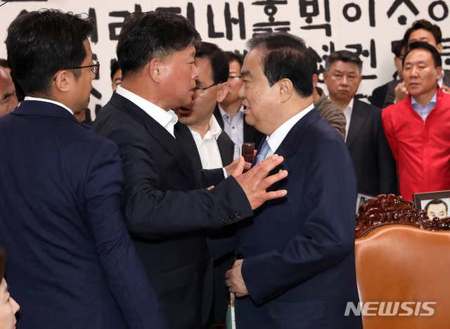 【서울=뉴시스】 박영태 기자 = 문희상 국회의장이 패스트트랙 철회를 요구하며 24일 오전 서울 영등포구 여의도 국회의장실을 항의방문한 자유한국당 나경원 원내대표 등 의원들과 이야기를 나누다 다른 일정차 의장실을 나서려 할때 김명연 의원이 막아서고 있다. 2019.04.24.
