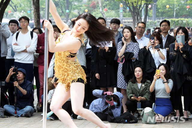 【서울=뉴시스】이윤청 수습기자 = 24일 오후 서울 중구 서울광장에서 열린 '2019 문화가 흐르는 서울광장'에서 조성아 폴댄스팀이 멋진 무대를 선보이고 있다. 2019.04.24.