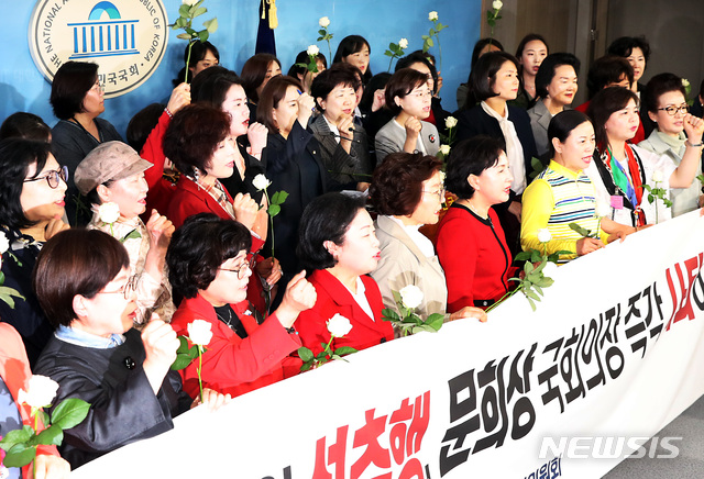 【서울=뉴시스】이종철 기자 = 자유한국당 여성의원들, 여성당직자, 여성보좌진들이 24일 서울 여의도 국회 정론관에서 백장미를 들고 문희상 의장의 성추행 규탄 기자회견을 하고 있다.
