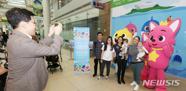 【인천공항=뉴시스】홍찬선 기자 = 인천공항공사(사장 구본환)는 스마트스터디(대표 김민석)와 협력해 핑크퐁과 아기상어를 활용한 글로벌 협업 마케팅을 4월부터 시행한다고 25일 밝혔다. 이날 인천공항 1여객터미널 면세지역에 위치한 “바닷속 인천공항 포토존”에서 여객들이 핑크퐁 및 아기상어 캐릭터 인형과 기념촬영을 하고 있다. 2019.04.25.(사진=인천공항공사 제공)