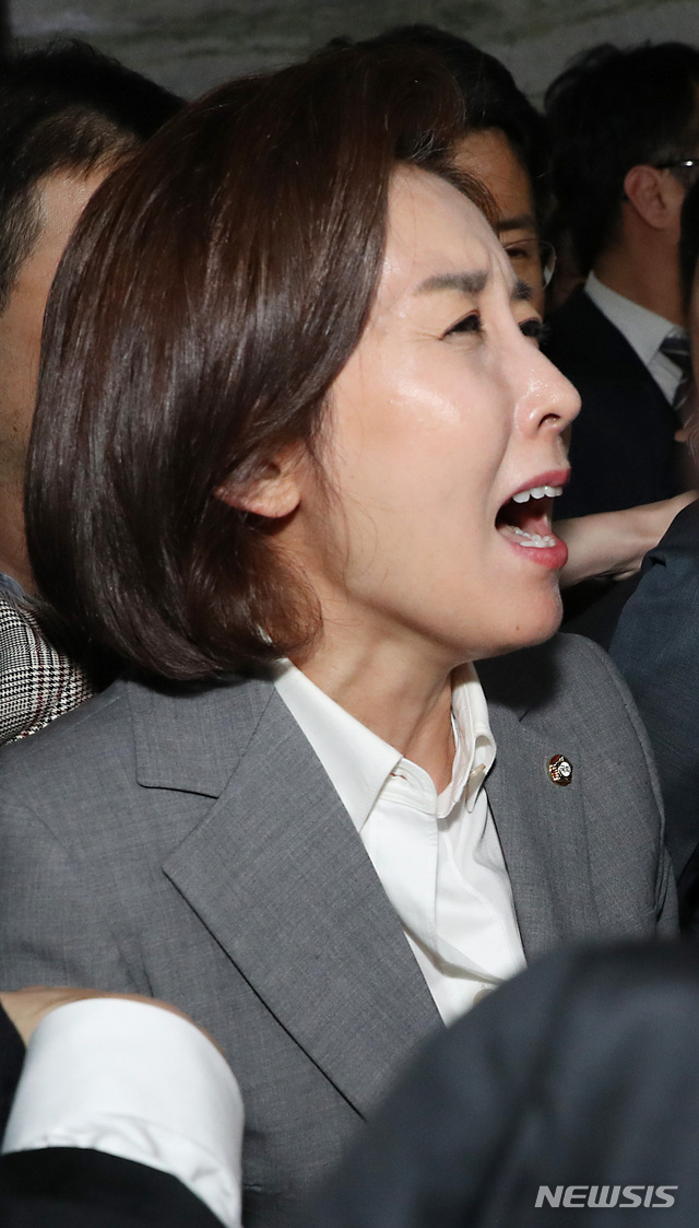【서울=뉴시스】이종철 기자 = 나경원 원내대표가 25일 오후 서울 여의도 국회 의안과 앞에서 국회 직원들이 의안과 문을 따고 들어가려 하자 오열하며 항의하고 사람들에게 갇힌 상태에서 오열하며 항의하고 있다. 2019.04.25.