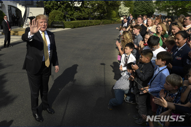 【워싱턴=AP/뉴시스】도널드 트럼프 미국 대통령이 25일(현지시간) 백악관 사우스 론에서 열린 '자녀를 직장에 데려가는 날'(Take Your Children to Work Day) 행사에 참석해 연설 후 참가 어린이들과 인사하고 있다.