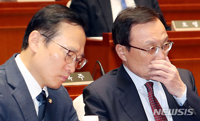 【서울=뉴시스】이종철 기자  = 26일 서울 여의도 국회에서 열린 민주당 의원총회에서 이해찬 대표와 홍영표 원내대표가 심각한 표정을 하고 있다. 2019.04.26.