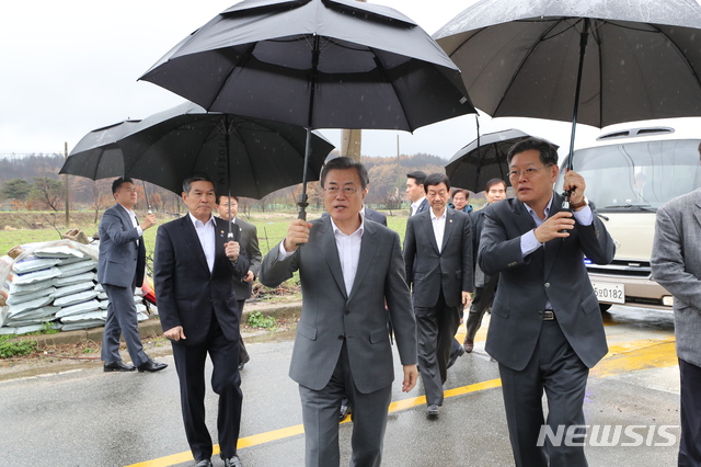 【고성(강원)=뉴시스】박진희 기자 = 문재인 대통령이 26일 강원도 고성군 토성면 성천리 마을 산불피해 복구현장을 방문하고 있다. 2019.04.26.