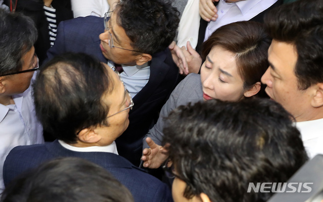 【서울=뉴시스】이종철 기자 = 26일 오후 한국당이 점거한 서울 여의도 국회 의안과를 찾은 민주당 홍영표 원내대표가 한국당 나경원 원내대표를 만나 설전을 벌이고 있다. 2019.04.26.