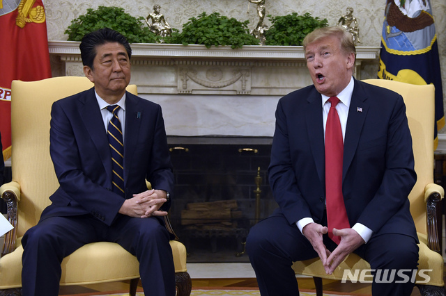 【워싱턴=AP/뉴시스】도널드 트럼프 미국 대통령이 26일(현지시간) 백악관 집무실에서 아베 신조 일본 총리와 얘기하고 있다.