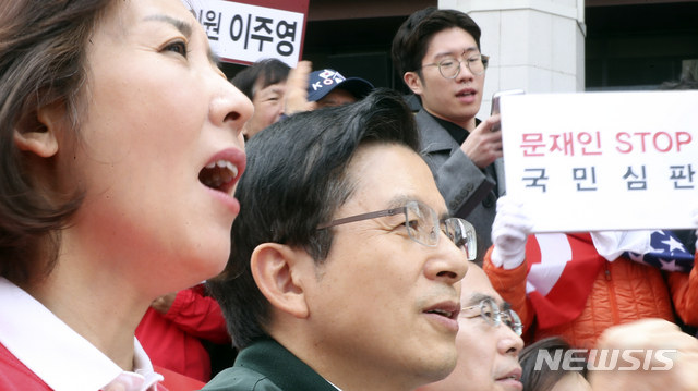 【서울=뉴시스】최진석 기자 = 황교안 자유한국당 대표와 나경원 원내대표를 비롯한 당 지도부와 당원들이 27일 서울 종로구 세종문화회관 앞에서 2차 문재인 정부 규탄 집회를 하고 있다. 2019.04.27.