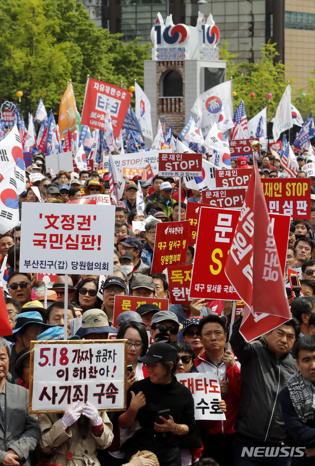 【서울=뉴시스】최동준 기자 = 자유한국당 당원들이 27일 서울 종로구 세종문화회관 앞에서 2차 문재인 정부 규탄 집회를 하고 있다. 2019.04.27. [email protected]