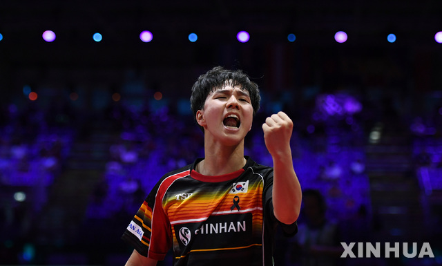 【부다페스트=신화/뉴시스】안재현이 26일(현지시간) 헝가리 부다페스트 헝엑스포에서 열린 국제탁구연맹(ITTF) 2019 세계탁구선수권대회 단식 8강전에서 선배 장우진과 경기하고 있다.