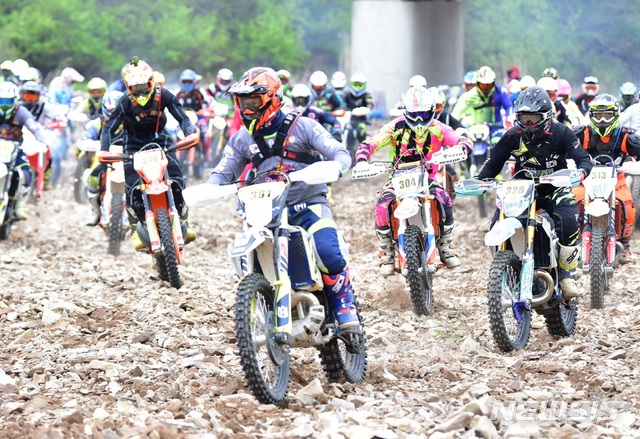 【청송=뉴시스】 김진호 기자 = 28일 경북 청송군에서 열린 '2019 청송 모터사이클 크로스컨트리 챔피언십 대회'에서 선수들이 질주하고 있다. 크로스컨트리는 험난한 코스를 주행하는 종목으로 순발력과 테크닉을 요구하는 고난이도의 익스트림 스포츠다. ㈔한국엔듀로연합회가 주최한 이번 대회는 전국 각지에서 300여명의 동호인들이 참가했다. 2019.04.28 (사진=청송군 제공)