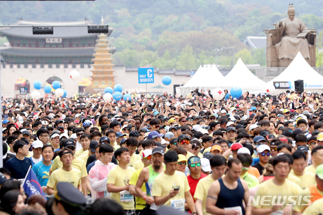 【서울=뉴시스】김병문 수습기자 = 28일 오전 서울 종로구 광화문광장에서 열린 2019 서울하프마라톤 참가자들이 힘차게 출발을 하고 있다 2019.04.28.