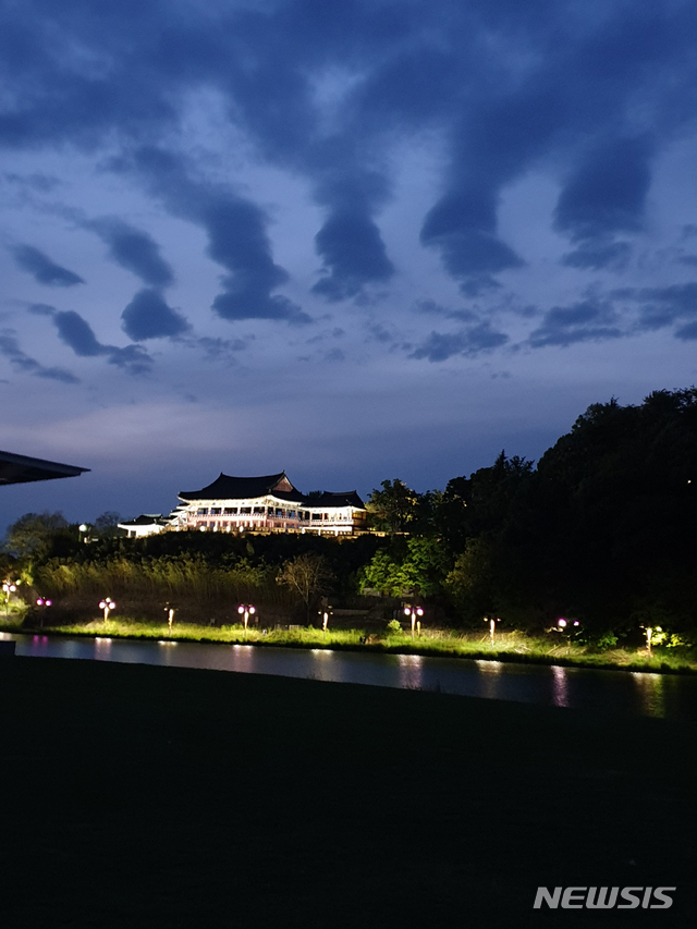 【밀양=뉴시스】안지율 기자 = 27일 오후 경남 밀양시 보물 제147호 영남루 야경과 밤하늘을 수놓은 구름이 한 폭의 풍경화를 연상케 하고 있다. 2019.04.28.