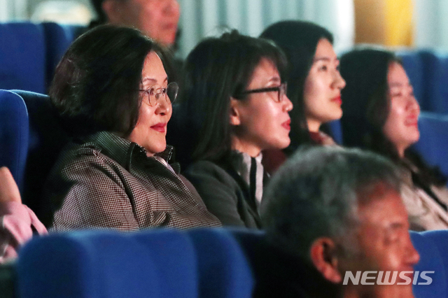 【서울=뉴시스】전신 기자 = 문재인 대통령 부인 김정숙 여사가 지난 26일 청와대 부속청사에서 세월호 참사 이후 남겨진 가족들의 이야기를 담은 영화 '생일'을 관람하고 있다. 2019.04.28. (사진=청와대 제공)