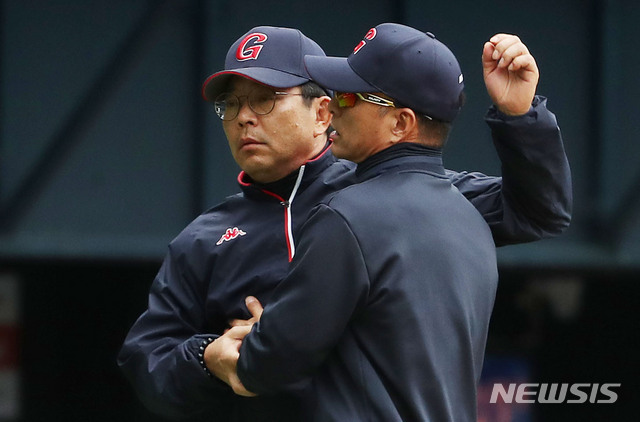 【서울=뉴시스】홍효식 기자 = 28일 서울 송파구 잠실야구장에서 열린 2019 프로야구 리그 두산 베어스와 롯데 자이언트의 경기, 롯데 양상문 감독이 8회말 2사 2,3루 두산 정수빈의 몸쪽볼 상황에서 두산에 항의하고 있다. 2019.04.28.