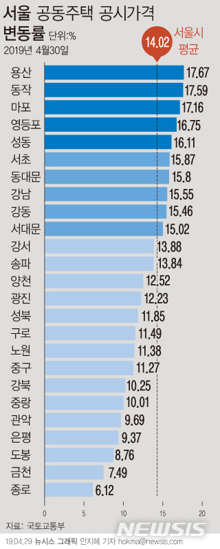 [그래픽]서울 공동주택 공시가 14.02%↑…'용산·동작·마포' 17% 이상↑