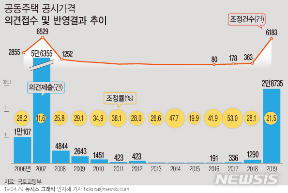 【서울=뉴시스】올해 공동주택 의견제출건수는 2만8735건으로 2007년(5만6355건) 이후 가장 많았다. 공시가 상향 의견이 597건, 하향 의견은 2만8138건이었다. (그래픽=안지혜 기자)