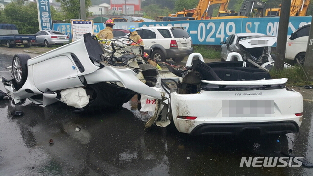 크게 파손된 포르쉐 스포츠카