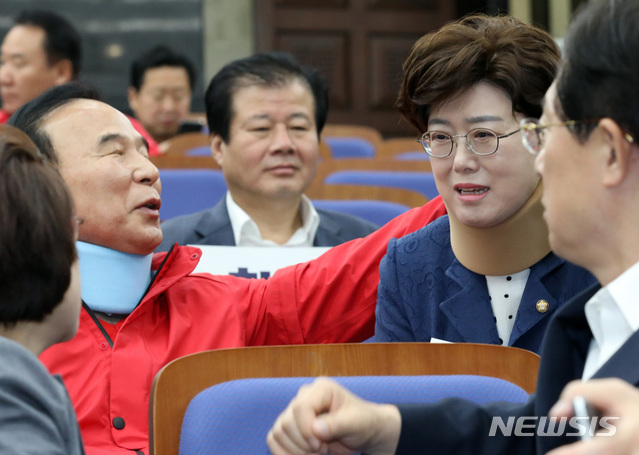 【서울=뉴시스】 박영태 기자 = 29일 오전 서울 영등포구 여의도 국회에서 열린 자유한국당 비상의원총회에 패스트트랙 법안 저지를 위해 더불어민주당 의원들과 충돌로 인해 부상을 당한 박덕흠, 최연혜 의원이 목에 깁스를 하고 나란히 앉아 이야기를 나누고 있다. 2019.04.29.
