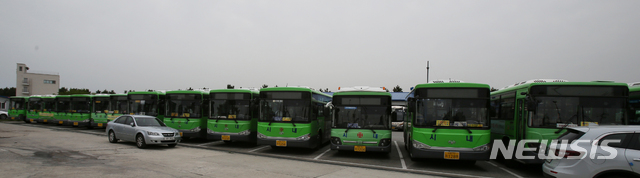 【강릉=뉴시스】김경목 기자 = 강원도 강릉·고성·속초·동해와 서울·경기 등을 운행하는 시내·시외버스 회사인 동해상사고속㈜ 노동조합의 총파업 첫날인 29일 강릉시 동해상사고속 차고지에 운행을 멈춘 버스들이 서 있다. 2019.04.29.