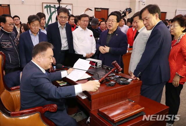 【서울=뉴시스】이종철 기자 = 29일 오후 서울 여의도 국회 문체위 회의실에서 열린 검찰개혁법의 패스트트랙(신속처리안건) 처리를 위한 회의에서 이상민 위원장이 의사봉을 두드리고 있다. 2019.04.29.
