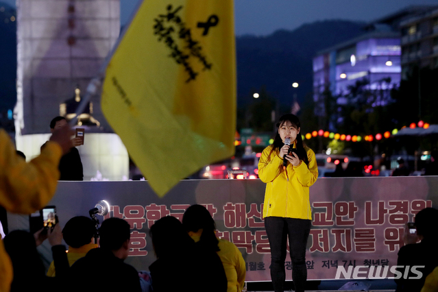 【서울=뉴시스】김병문 수습기자 = 30일 오후 서울 종로구 광화문 광장에서 청년당 주최로 '자유한국당 해산! 나경원 처벌! 세월호 광장 천막당사 저지를 위한 촛불집회'가 열리고 있다. 2019.04.30.