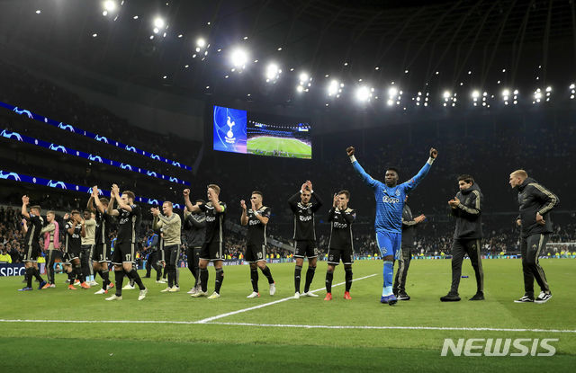 【런던=AP/뉴시스】아약스(네덜란드)선수들이 4월30일(현지시간) 영국 런던의 토트넘 홋스퍼 스타디움에서 열린 2018-19 UEFA 챔피언스리그 4강 1차전에서 토트넘을 이기고 자축하고 있다.
